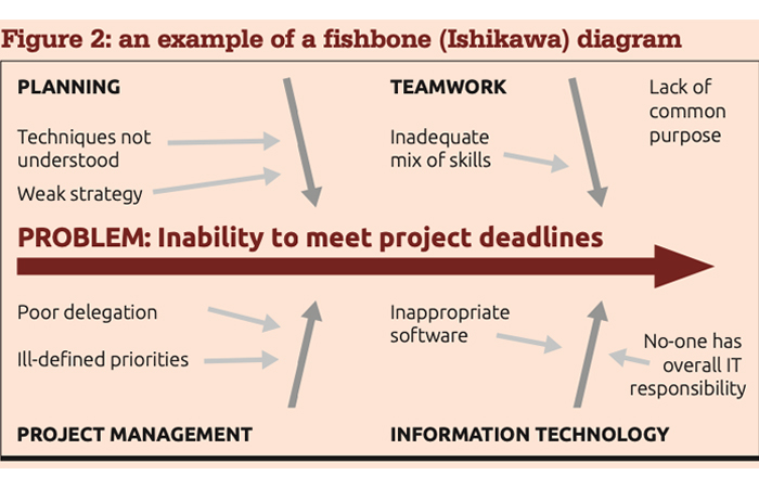 Cause and effect diagrams, sometimes called fishbone diagrams or Ishikawa diagrams after inventor Professor Kaoru Ishikawa of Tokyo University (see Figure 2) are useful for brainstorming, exploring different perspectives and working out the factors that might otherwise be forgotten. By going through the process of building one with your team, everybody gains insight into the problem and can explore possible solutions. They will benefit too from sharing each other’s contributions, leading to a common understanding of the problem within the team.